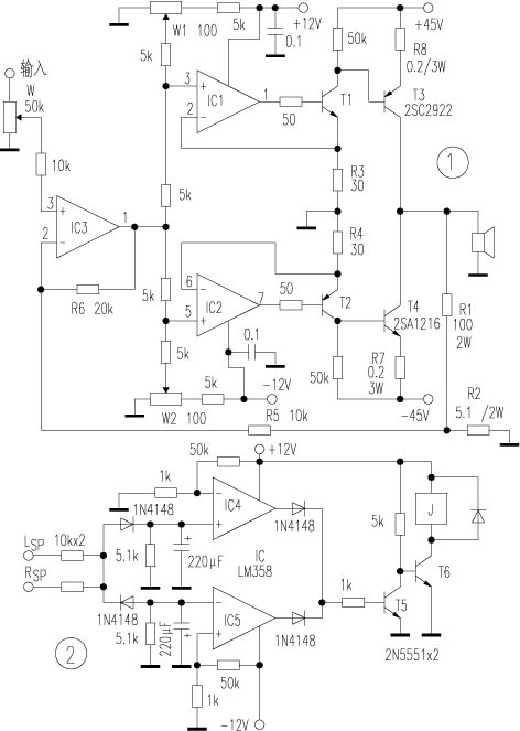 运放采用NE5532或AD827等双运放,T1、T2选中功率管2SB647、2SD667等,末级功放管可选用三肯对管2SC2922、2SA1216或2SC3281、2SA1302等音频对管,电阻用1/4W金属膜电阻。