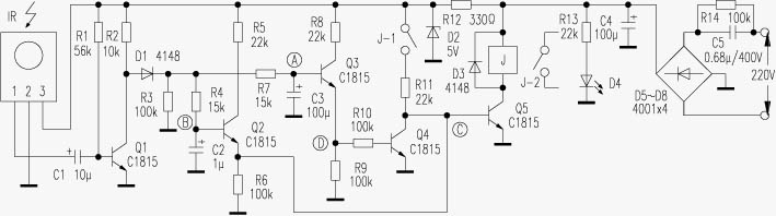 | 选择分类:当前分类——电子制作 相关联或者相类似的文章: 怎样安装AT51编程板的USB转串口软件?(8206) 装在火柴盒里的悄悄听别人讲话的发射器(1999) 红外感应电子狗制作详解(1560) 台灯触摸开关(1560) ++ 带限流保护的可调稳压电源 (1331) 分立电子开关、OTL功放详解(1274) 用单片机控制字符型液晶显示模块(1249) 厨房定时器(1160) 电子制作专用微型模块盒子(1132) 性能可靠的60W石英灯用电子变压器(1091) 做梦机的制作(1078) 自己动手制作无线话筒(944) MA21小型电子调速器的制作(939) 500米无外壳四通道遥控模块(926) 关于“D40”最早的文章(907) 用三端稳压LM317制作的甲类功放(898) ++ 汽车电池电压监视器 ++(897) 电子小鸡(896) 简单实用的遥控开关(895) 简易电话机测试装置(889) 首页 前页 后页 尾页 本站推荐: | 简单实用的遥控开关 2003年,第7期,类别:电子制作 本遥控开关仅用了5只三极管,整个电路可装在尺寸仅40mm×50mm的电路板上,能对各种电器进行遥控开/关操作,电路见附图。所使用的遥控发射器是普通家电遥控器。接收控制电路只要按图正确焊接,无须调试即可成功。 1、 本站不保证以上观点正确,就算是本站原创作品,本站也不保证内容正确。 2、如果您拥有本文版权,并且不想在本站转载,请书面通知本站立即删除并且向您公开道歉! |