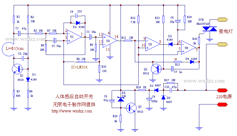 微波自动节能开关,两根红线接220电源,另两根兰和黑线接100W以内电灯或其它电路电器,电路采用数只三极管和一只LM324组装,感应圈直径15厘米。大家可按图组装,图已重新更改参数,经多次试验,调试简单,基本上都能一装就成。 ![]() ![]() 另外用此感应开关电路组装好的感应路灯,带罩和灯座,只要装入螺口灯炮就可在晚上实现人来灯亮人走灯灭的延时照明功能。注意:许多网友说不能起作用,都是因为白天做试验的原因,感应开关上有光敏电阻,只有在晚上或将光敏电阻断开一脚才可以在强光的白天起作用。 1、 本站不保证以上观点正确,就算是本站原创作品,本站也不保证内容正确。 2、如果您拥有本文版权,并且不想在本站转载,请书面通知本站立即删除并且向您公开道歉! |