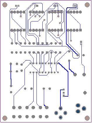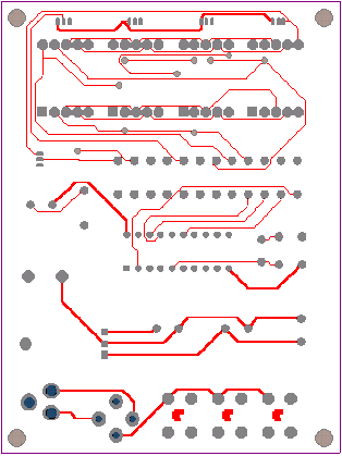 由于使用了四只数码管密集排列,因此只能采用双面印刷板设计,图4、5分别为正面(元件面)、反面的印板图。尺寸3000milx4000mil(7.62cmx10.16cm)。图6为计算机输出的三维仿真印制板。