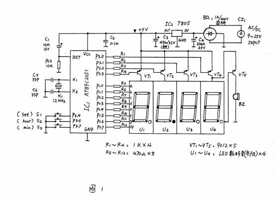 P3.4、P3.5、3.7外接了三个轻触式按键,这里我们分别命名为:模式设定键set(P3.4)、时调整键hour(P3.5)、分调整键min(P3.7)。C1、R13组成上电复位电路。VT5及蜂鸣器Bz为闹时讯响电路。三端稳压器7805输出的5V电压供整个系统工作。此电子钟可与任何9~20V/100mA的交直流电源适配器配合工作,适应性强。