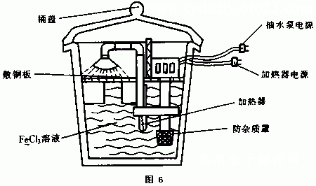 | 选择分类:当前分类——实用电路 相关联或者相类似的文章: 信号发生与频率测量09年技能大赛(1783) 数字电路循迹小车(1783) 十字旋转LED点阵套件制作说明(1783) 直流电机控制电路专辑(1783) 水位控制电路(898) 几种微型电机驱动电路实验和分析(884) 电话线路防盗报警器(865) 光电耦合器的应用(864) 节能型摩托车整流稳压器(860) 给彩电加装无线伴音发射装置(852) 电子灭蝇器(847) 利用TL431作大功率可调稳压电源(805) 电话转呼器(801) 论电视机代替万用表、示波器的可行性(794) 红外接收头的构造(770) 40kHZ超声波收发电路集锦(756) LM567集成电路的应用 (749) 金属接近开关(746) 单运放构成的单稳延时电路(744) 超声波测距精度的探讨(742) 首页 前页 后页 尾页 本站推荐: | 自制印制板腐蚀机 作者:黄胜利 来源:未知 该腐蚀机具有节省时间,减少FeCl3溶液的浪费,以及降低侧蚀使印制线路板的精细之处更加完美可靠等特点。它是通过加热使氧化还原反应加速,从而将敷铜板表面的铜加速氧化成Cu2+;同时利用水流的冲击带走沉积在铜板表面及附近的Cu2+,使化学反应更充分更 快地进行。 (3)把5mm厚、400mm×400mm塑料板加工成图3圆盘形状,半径与桶的三分之二高度处内径相当;小孔直径为3mm,相邻孔中心距为lmm;另外两个大孔直径与抽水泵的进出水管外径相当,间距也与进出水管相同;还有一孔用来放入加热器,孔径大于加热器外径2mm。 (3)溶液通过淋浴喷头均匀喷洒向印制板,加热情况下三分钟即可腐蚀完毕,不加热一般需6分钟。 (5)平时不用可拔下加热器及抽水泵的电源开关。长时间不用时最好取出加热器和抽水泵的进水管,并冲洗干净,以防止溶液沉积在加热器表面影响加热效果和沉积在进水管的防杂质罩内影响溶液流动。 1、 本站不保证以上观点正确,就算是本站原创作品,本站也不保证内容正确。 2、如果您拥有本文版权,并且不想在本站转载,请书面通知本站立即删除并且向您公开道歉! |