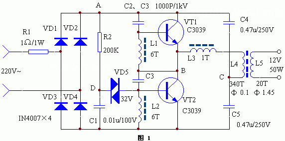 电路正常工作时,A点工作电压约为215V,B点约为108V,C点约为10V,D点约为25V。如果不振荡,检查VT1、VT2及L1、L2、L3的相位是否正常(交换L3的两根接线即可)。改变L5的匝数可改变输出电压。