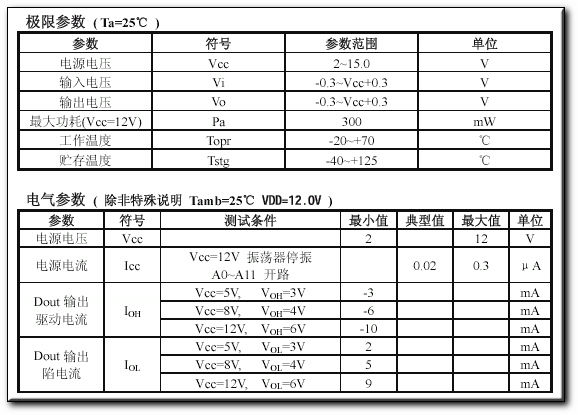 A0-A11 1-8、10-13 地址管脚,用于进行地址编码,可置为“0”,“1”,“f”(悬空),必须与2262一致,否则不解码