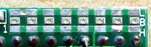 网友可以看到,跳线区是由三排焊盘组成,中间的8个焊盘是PT2272解码芯片的第1~8脚,最左边有1字样的是芯片的第一脚,最上面的一排焊盘上标有L字样,表示和电源地连同,如果用万用表测量会发现和PT2272的第9脚连同;最下面的一排焊盘上标有H字样,表示和正电源连同,如果用万用表测量会发现和PT2272的第18脚连同.所谓的设置地址码就是用焊锡将上下相邻的焊盘用焊锡桥搭短路起来,例如将第一脚和上面的焊盘L用焊锡短路后就相当于将PT2272芯片的第一脚设置为接地,同理将第一脚和下面的焊盘H用焊锡短路后就相当于将PT2272芯片的第一脚设置为接正电源,如果什么都不接就是表示悬空。