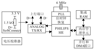 ⑤   PHILIPS串行接口引擎PSIE。PHILIPS的SIE完全实现USB协议层。考虑到速度,它是全硬件的, 不需要固件(微程序)介入。这个模块的功能包括:同步模式识别、并 /串转换、位填充/不填充、CRC校验、PID确认、地址识别以及握手鉴定。