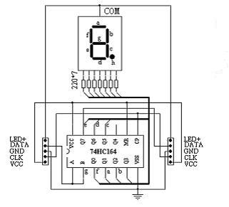 该板主要为端口扩展用的,可以1级到多级的连接使用(本站曾经使用过四十多级给客户开发过产品)。使用1寸红色超亮数共阳码管,一个笔画由一个组成。电阻和74HC164为贴片元件,体积小巧。板上有四级连接在一起,其中各级间已经预留有开口,如果不用四级,可以分别掰开使用(下面的图为已经掰开了一级),如果要使用四级以上的,也可以很方便的首尾相接起来使用单级接线原理图。