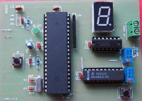 函数信号发生器套件:提供原理图、 安装图、 源程序、元件清单、详细制作说明参考资料、整套元件,该函数发生器采用51 单片机作为控制核心,外围采用模拟/数字转换电路(DAC0832)、运放电路(LM324)、按键和LED显示灯电路等。电路采用51单片机和一片DAC0832数模转换器组成数字式低频信号发生器。函数信号发生器,它具有价格低、性能高和在低频范围内稳定性好、操作方便、体积小、耗电少等特点。由于采用了LM324运算放大器,使其电路更加具有较高的稳定性能,性能比高。此电路清晰,出现故障容易查找错误,操作简单、方便。