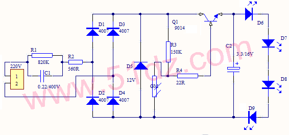功能: 工作电压:220V,光控LED小夜灯,通过光敏电阻感应环境光线的强弱来控制LED的发光强度,实现白天自动关闭,夜晚自动打开的功能。